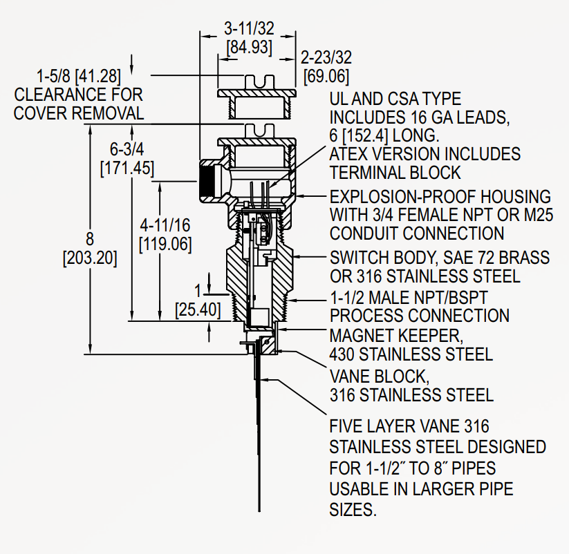 | ประเภทสวิตช์ | มาตรฐานสวิตช์สแน็ป SPDT, สวิตช์สแน็ป DPDT เป็นตัวเลือก | กระบวนการเชื่อมต่อ | 1-1/2˝ NPT ตัวผู้ หรือ BSPT ตัวผู้ 1-1/2˝ |